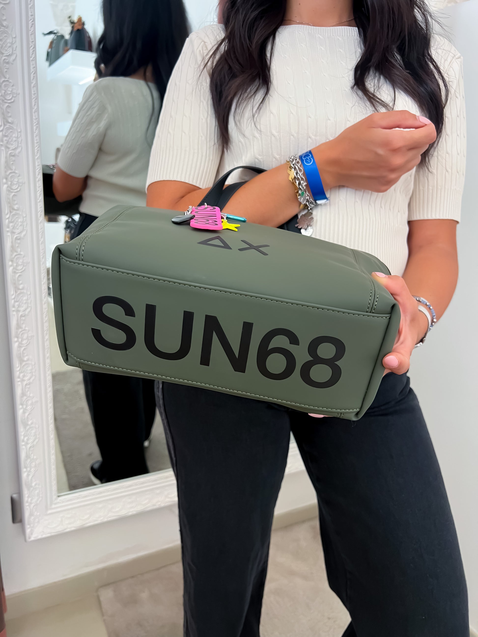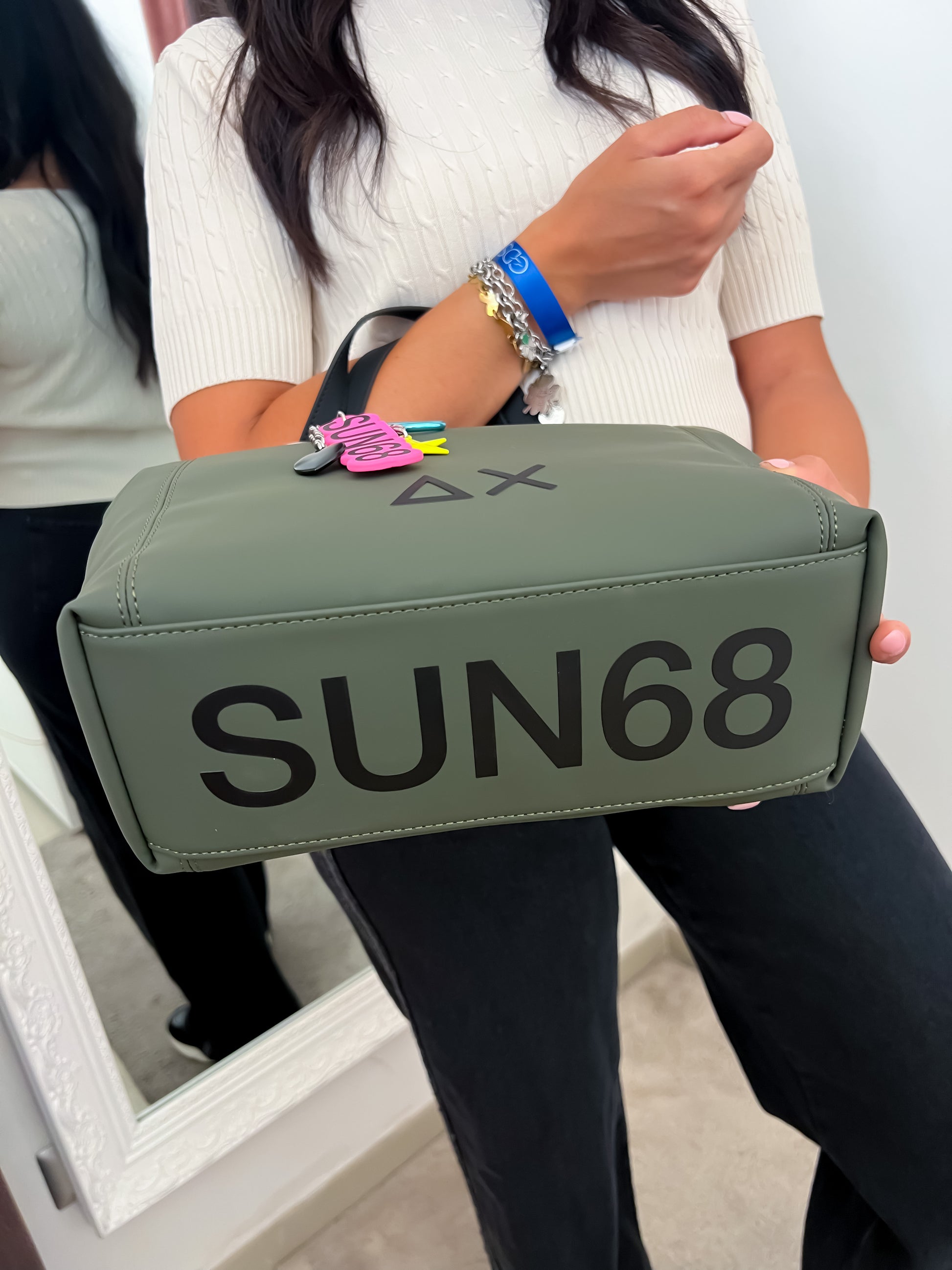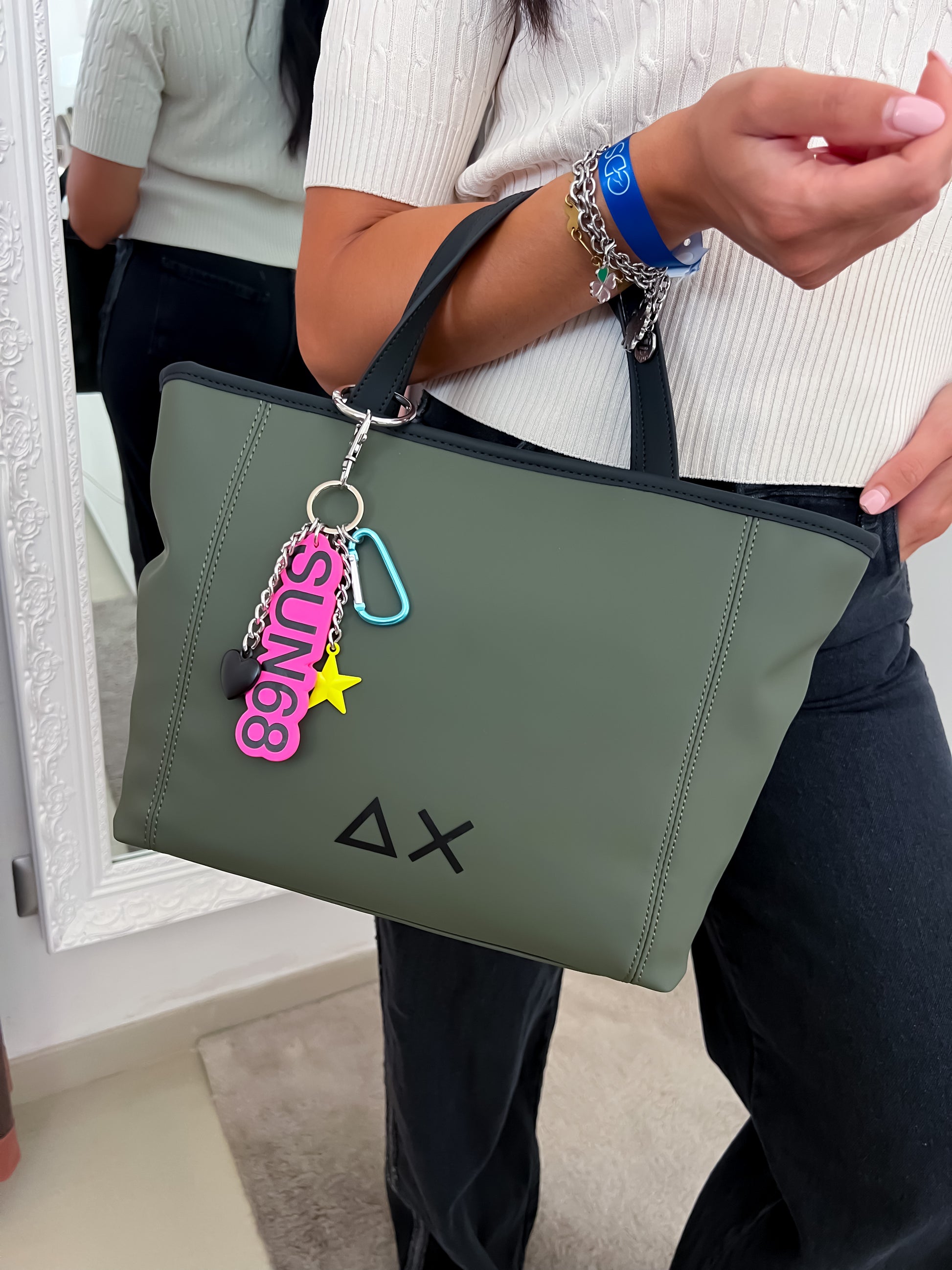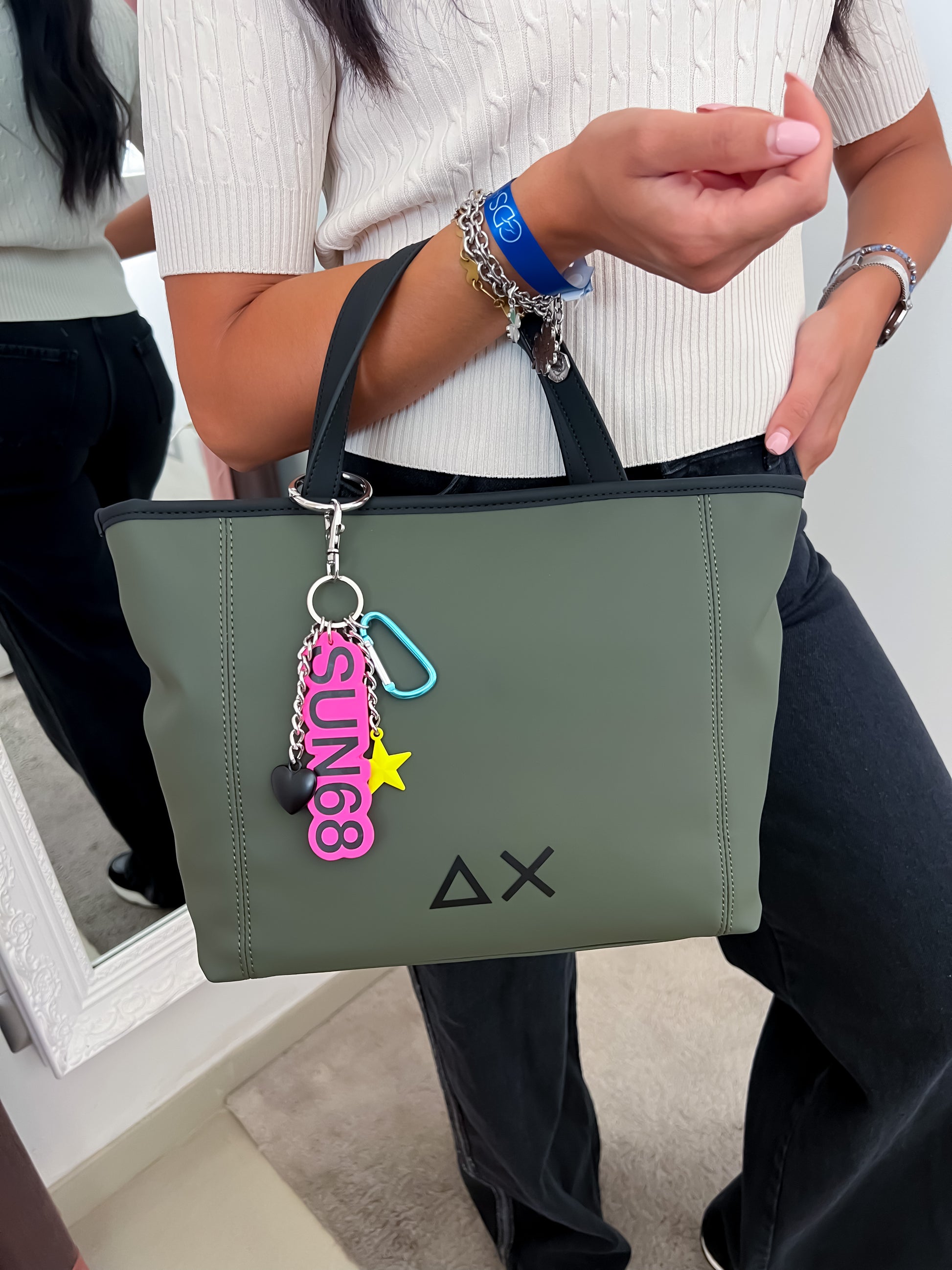 Jacqueline è l'iconica shopping bag SUN68 progettata per la città e il tempo libero. Il suo design capiente è valorizzato dalla tracolla rimovibile e dai manici comodi per essere portata a mano, sotto il braccio o crossbody. I charms e il maxi logo stampato danno un tocco di brio.
